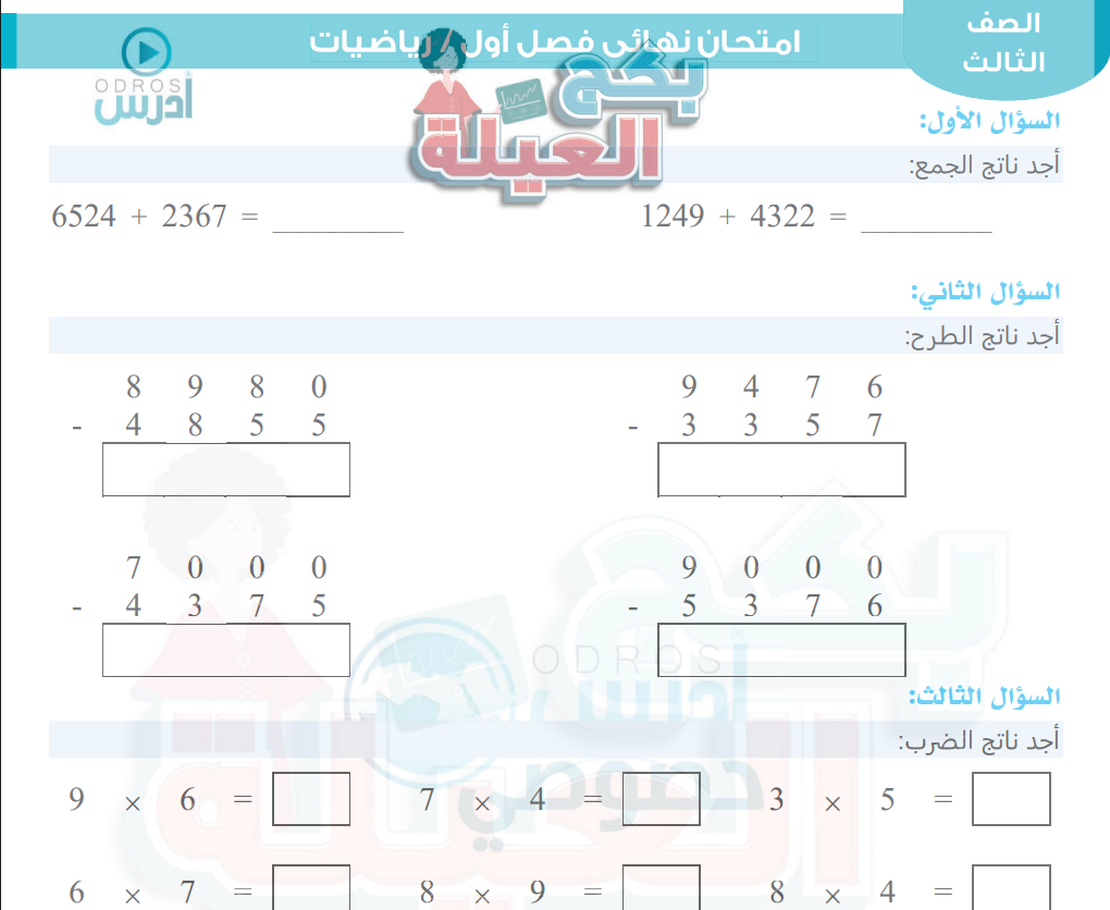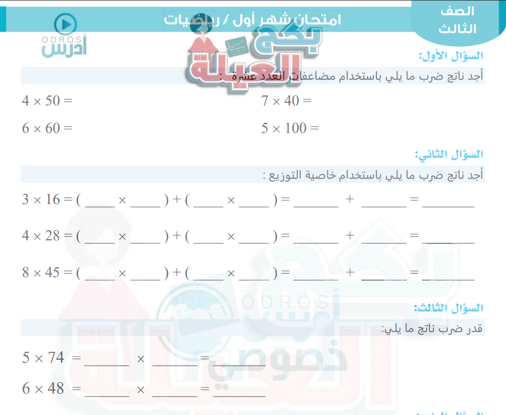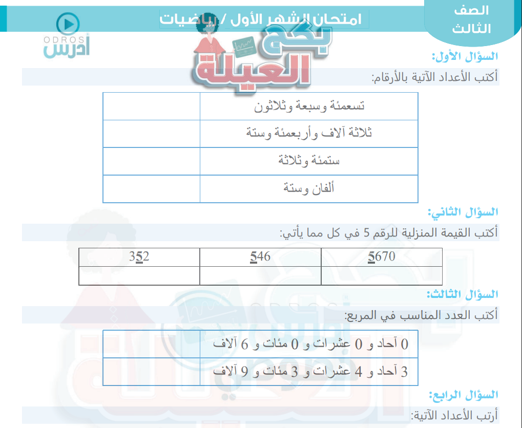 رياضيات الشهر الاول 4 الفصل الاول صف ثالث