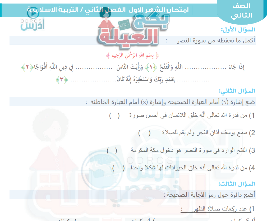 تربية اسلامية الشهر الاول 1 الفصل الاول الصف الثاني